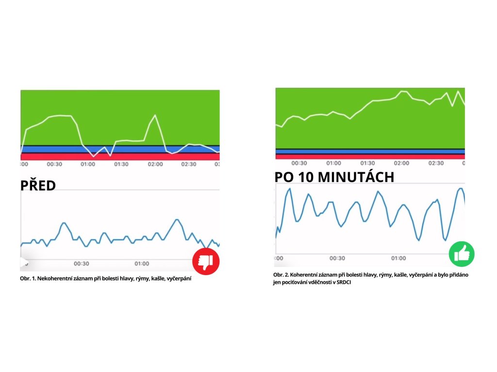 - Zkreslená koherence: I když se na obrazovce zdá, že zařízení měří (např. ukazuje nízkou koherenci – červená barva), data nejsou platná, protože nejsou založena na skutečném průtoku krve.