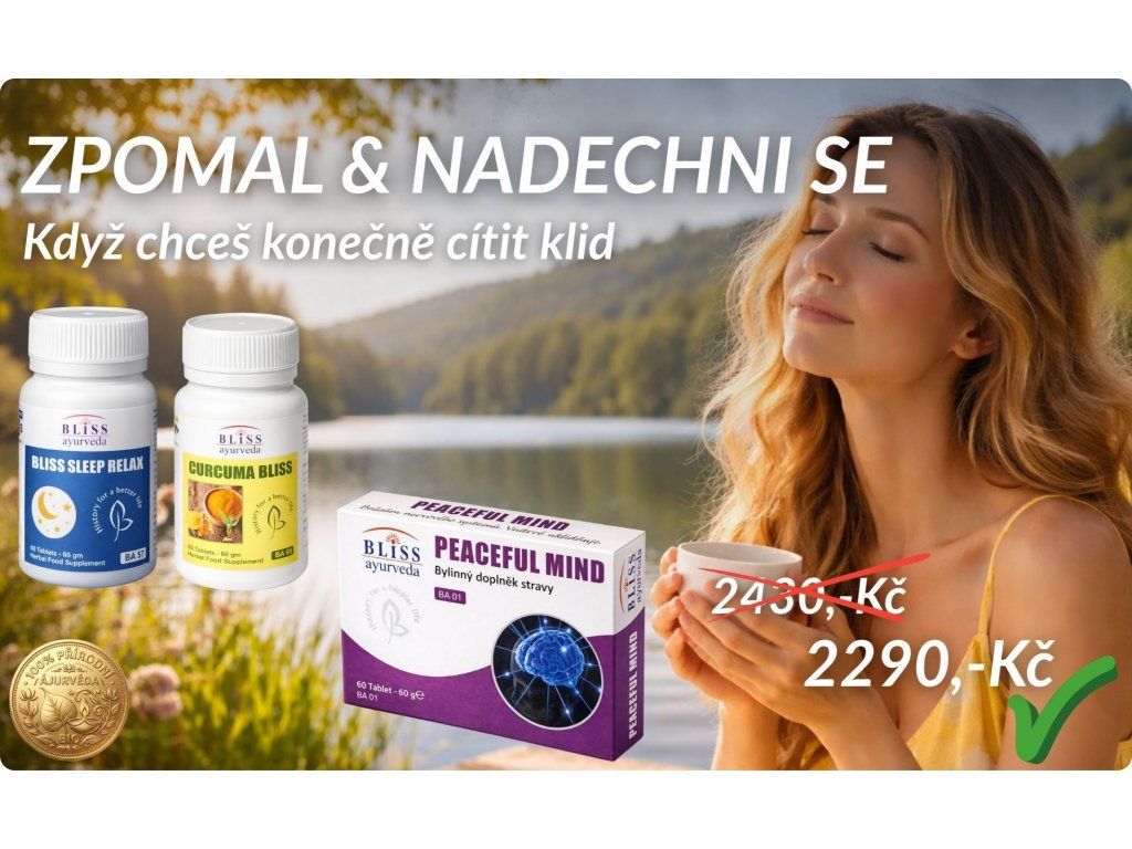 které společně vytvářejí harmonický systém péče o tělo i mysl. Kombinace produktů Peaceful Mind, Curcuma Bliss a Bliss Sleep Relax přináší komplexní podporu pro každodenní fungování, regeneraci i psychickou pohodu.